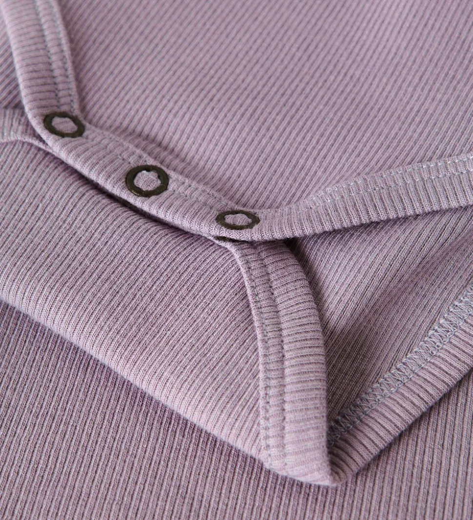 Fin Name It body i en flot lilla nuance med ribstruktur. Bodyen har fin blondekant i halsen og lange ærmer. Den lukkes mellem benene med trykknapper.