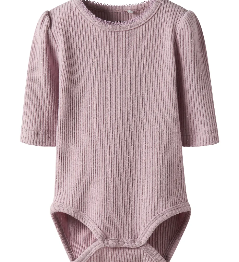 Blød Name It body i en delikat lilla nuance med fin ribstruktur og diskret glimmer. Bodyen har lange ærmer og en rund halsudskæring med dekorative kanter. Navnetabellen Name It sikrer praktisk lukning med trykknapper i bunden, hvilket letter påklædningen. De lange ærmer og den tætsiddende pasform giver en behagelig følelse mod huden.