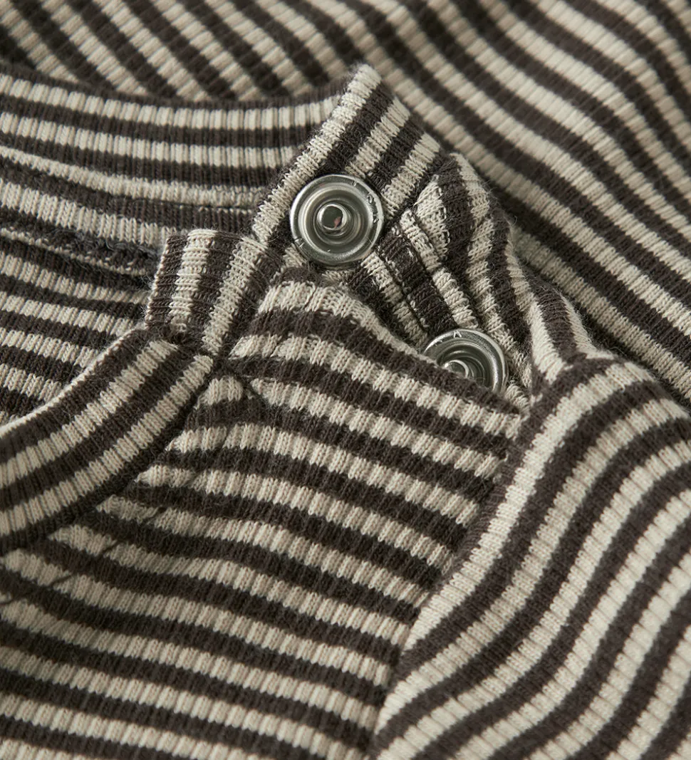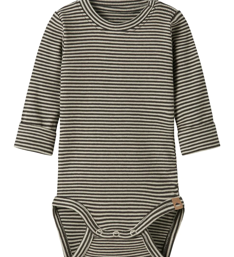 Flot Name It body med et tidløst stribet mønster i brun og beige, samt en fin ribstruktur. Bodyen har ekstra lange ærmer, som kan gives et ombuk hvis det ønskes. Name It bodyen åbnes med trykknapper ved venstre skulder samt mellem benene.