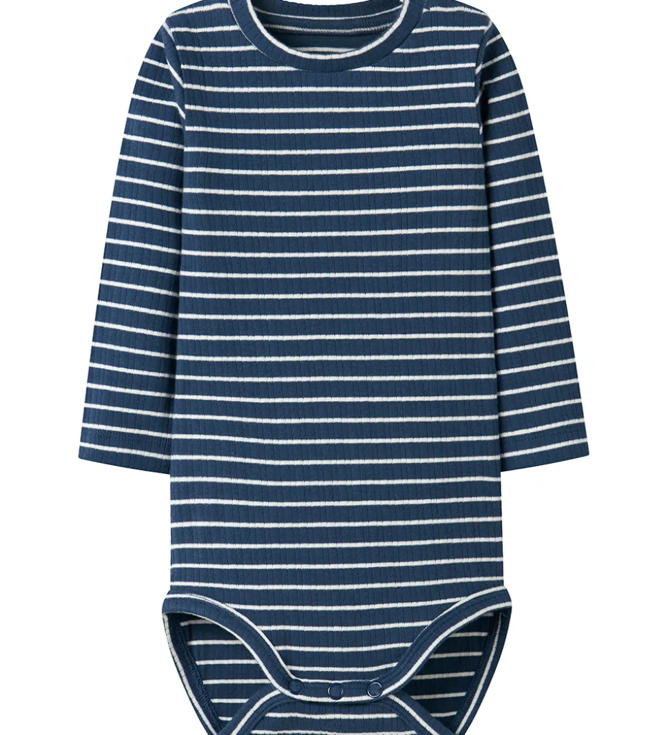 Smart Name It body i mørkeblå med hvide striber og fin ribstruktur. Bodyen har en rund halsudskæring og lange ærmer. Den lukkes med trykknapper ved venstre skulder og mellem benene.