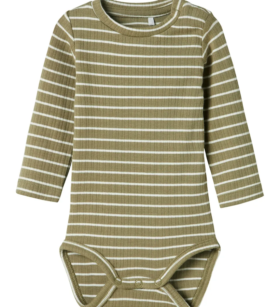 Flot Name It body i støvet grøn med hvide striber og fin ribstruktur. Bodyen har en rund halsudskæring og lange ærmer. Den lukkes med trykknapper ved venstre skulder og mellem benene.