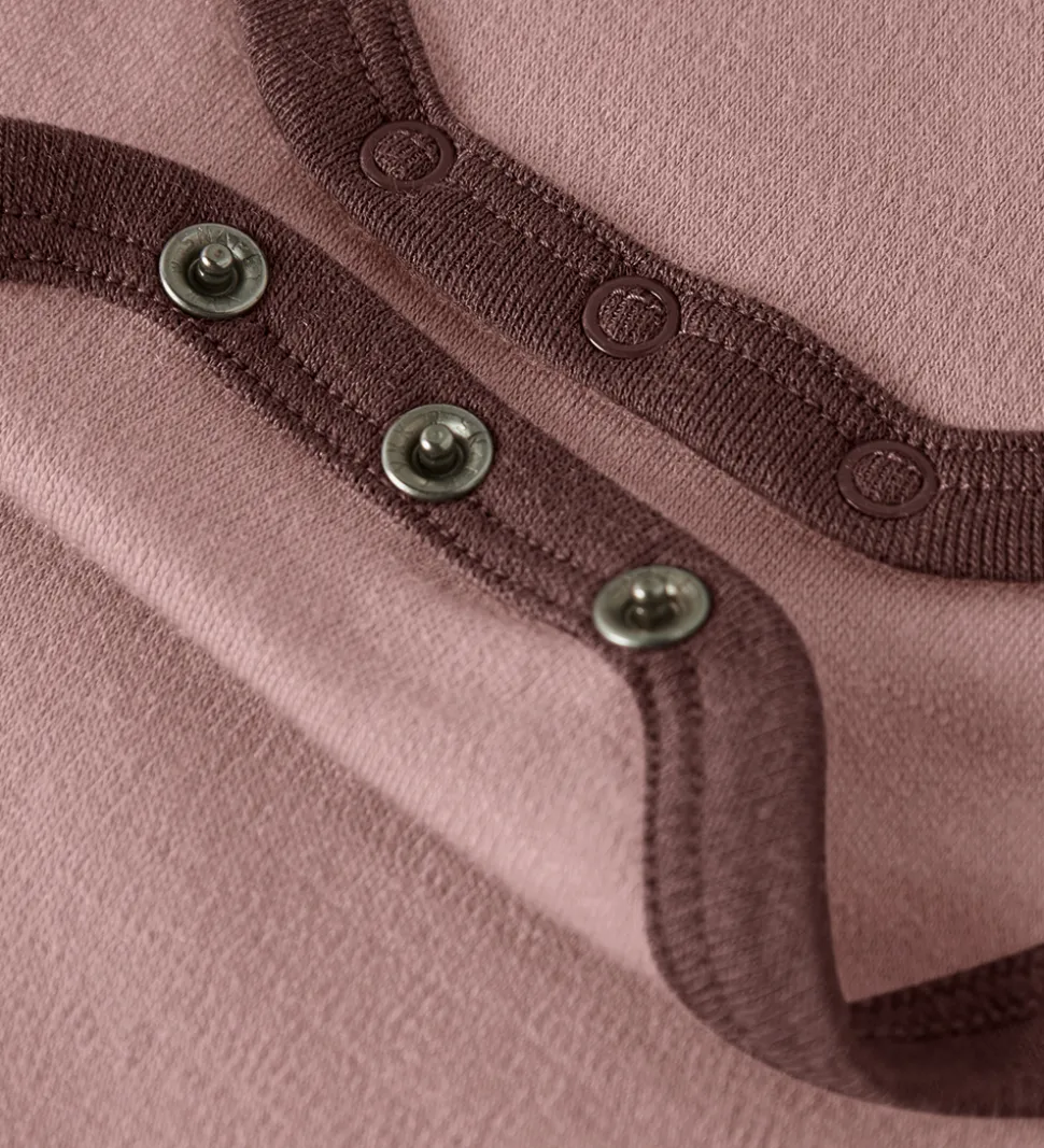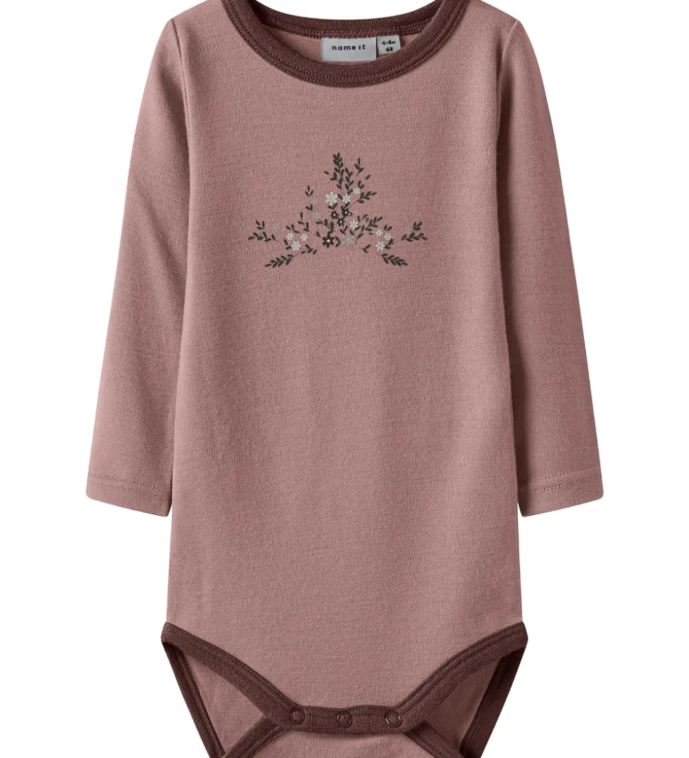 Flot Name It body i støvet lilla med blomsterprint på brystet i grønne, hvide og lilla nuancer. Bodyen har mørkere kanter. Den har en rund halsudskæring og lange ærmer, og lukkes mellem benene med trykknapper. Bodyen er fremstillet i lækkert merinould.