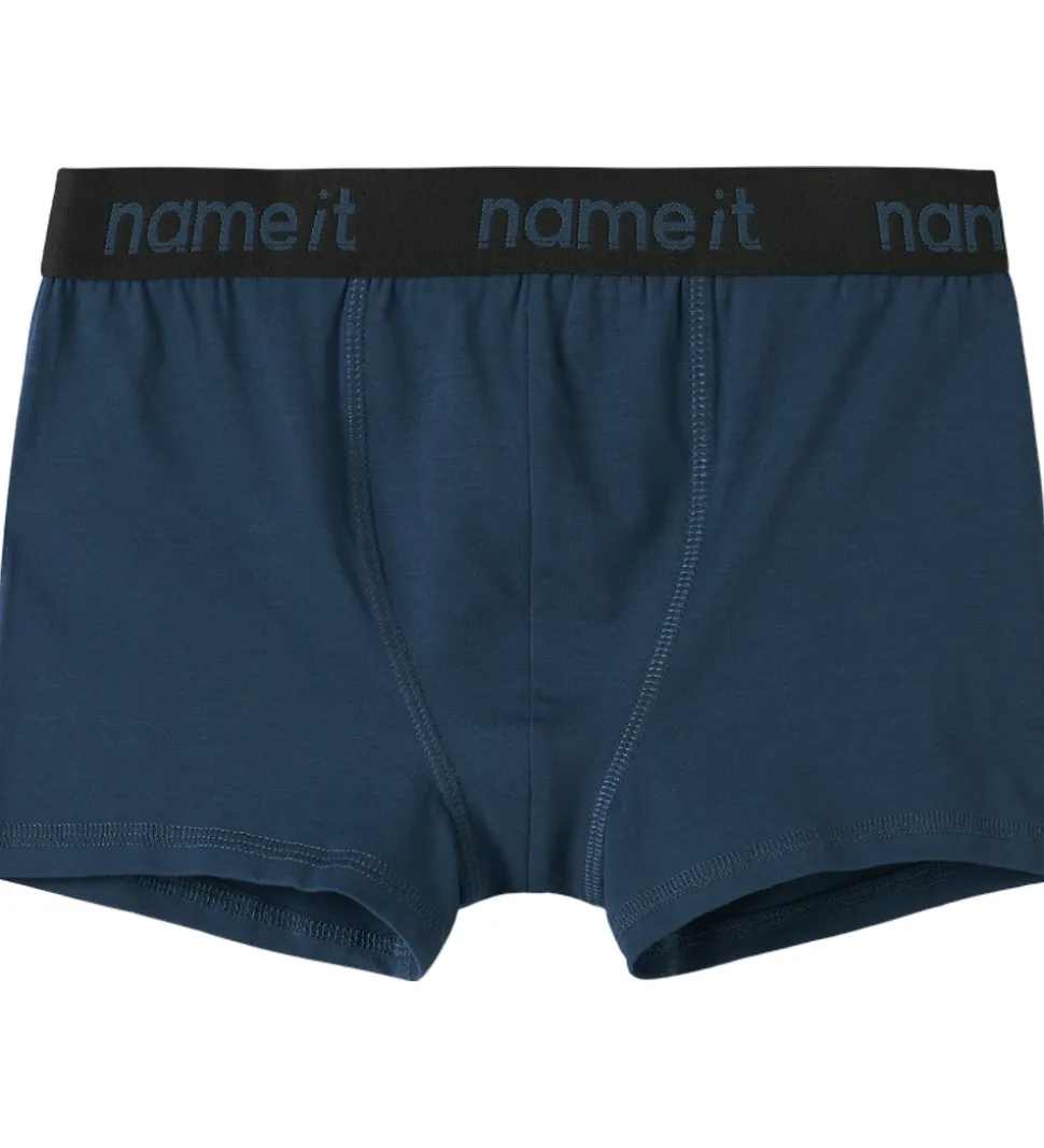 Praktiske Name It boxershorts i en pakke med tre par. Boxershortsene kommer i forskellige farver: ensfarvet mørkeblå, sort og mørkeblå med skateboardsprint. Name It boxershortsene har en elastikkant, hvor brandnavnet står, der sikrer en god pasform.