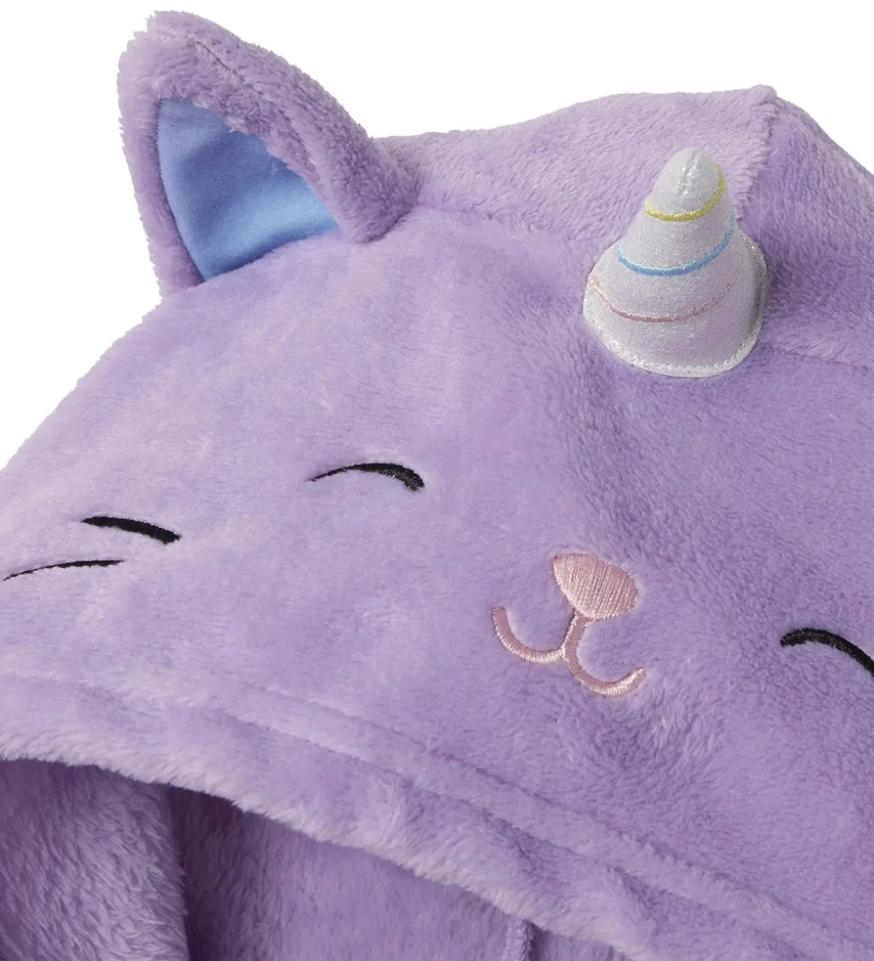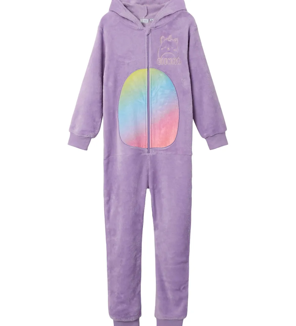 Flot Name It buksedragt i en fin lilla plys med en brodering af caticorn Squishmallowen Cienna på venstre bryst. Hætten er pyntet med søde ører og horn og fortil prydes den af et farverigt regnbuemønster på maven i en cirkel.