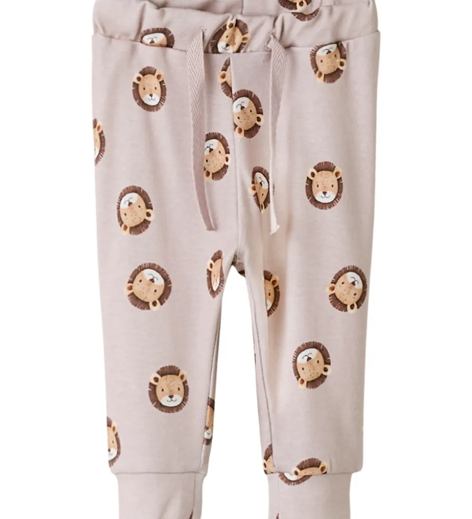 Charmerende bukser fra Name It i rosa med et alloverprint af løvehoveder. Name It bukserne er udstyret med en elastisk talje, som kan justeres med knapper indvendigt. Foran er der dekorative snører, og i benåbningerne er der brede kanter.