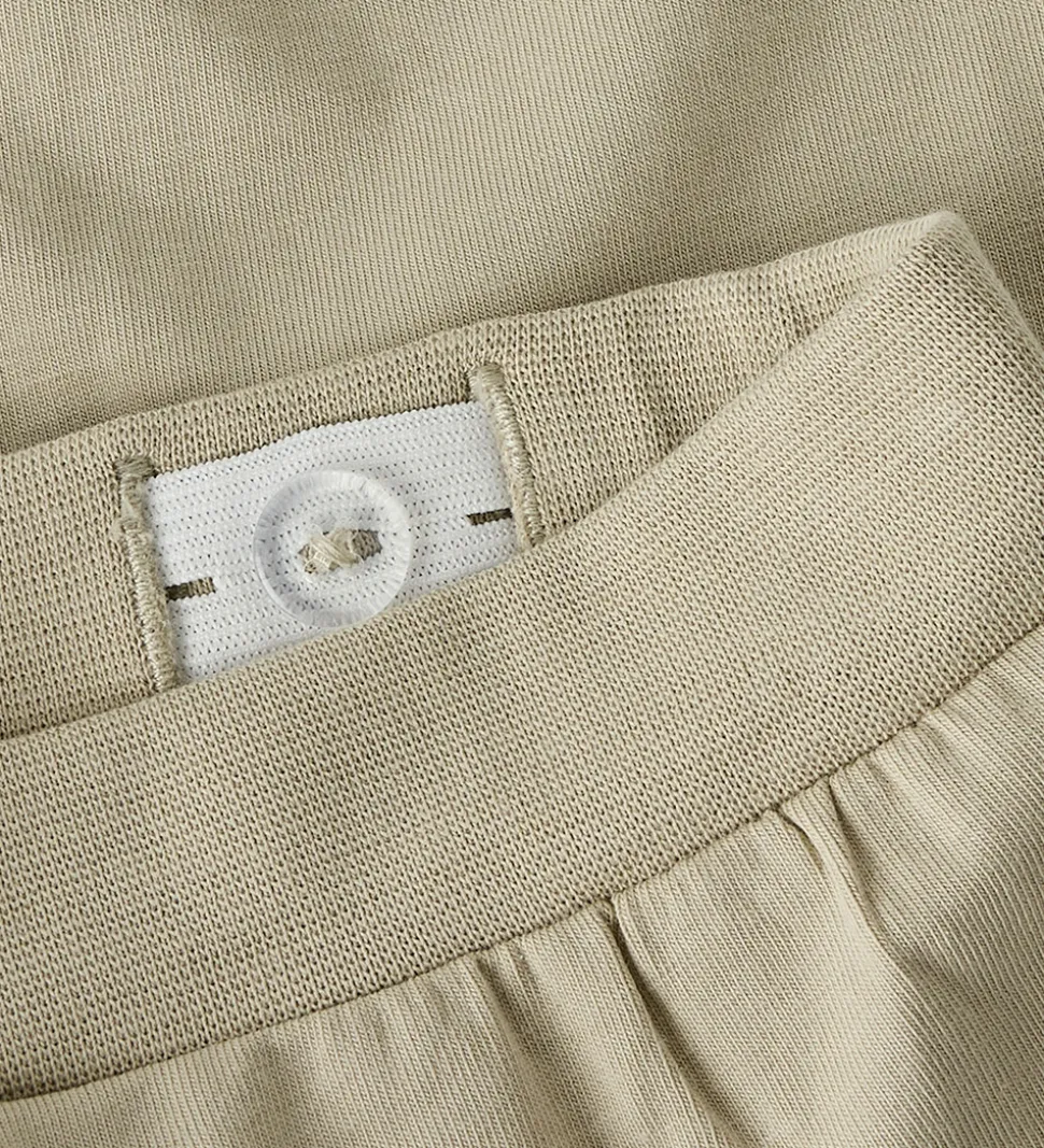 Skønne bukser fra Name It i en lys beige farve med et sødt dinosaurprint i mørkegrøn på det ene ben. Name It bukserne har en elastisk talje, som kan justeres med knapper indvendigt. Fortil er der dekorative snører. Buksebenene afsluttes med ribkanter, der sikrer en god og behagelig pasform.