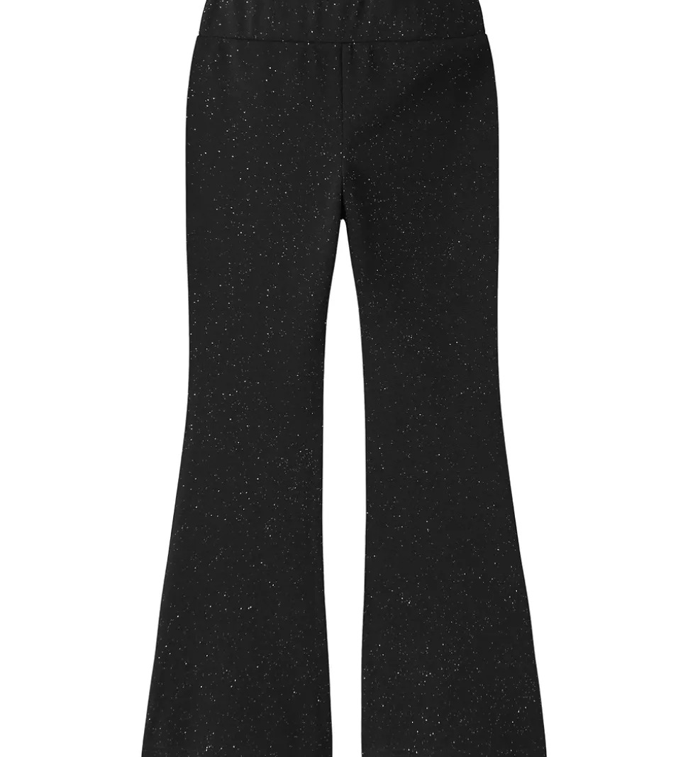 Stilfulde bukser fra Name It i sort med glimmer. Bukserne har en klassisk pasform med lige ben, der let går ud forneden. Buksebenene afsluttes med en ren kant uden rib, hvilket giver et enkelt udtryk. Den elastiske talje sikrer en behagelig pasform.