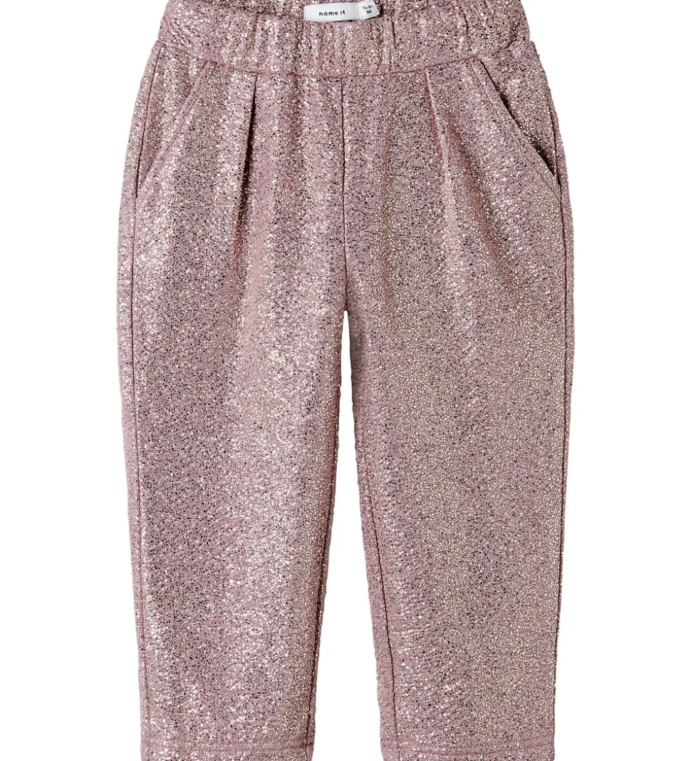Festlige bukser fra Name It i rosa med glimmer. Name It bukserne har en elastisk talje, som kan justeres med knapper indvendigt. Bukserne har diskrete læg foran, og lommer i siderne. Bukserne har en afslappet pasform med lige ben.