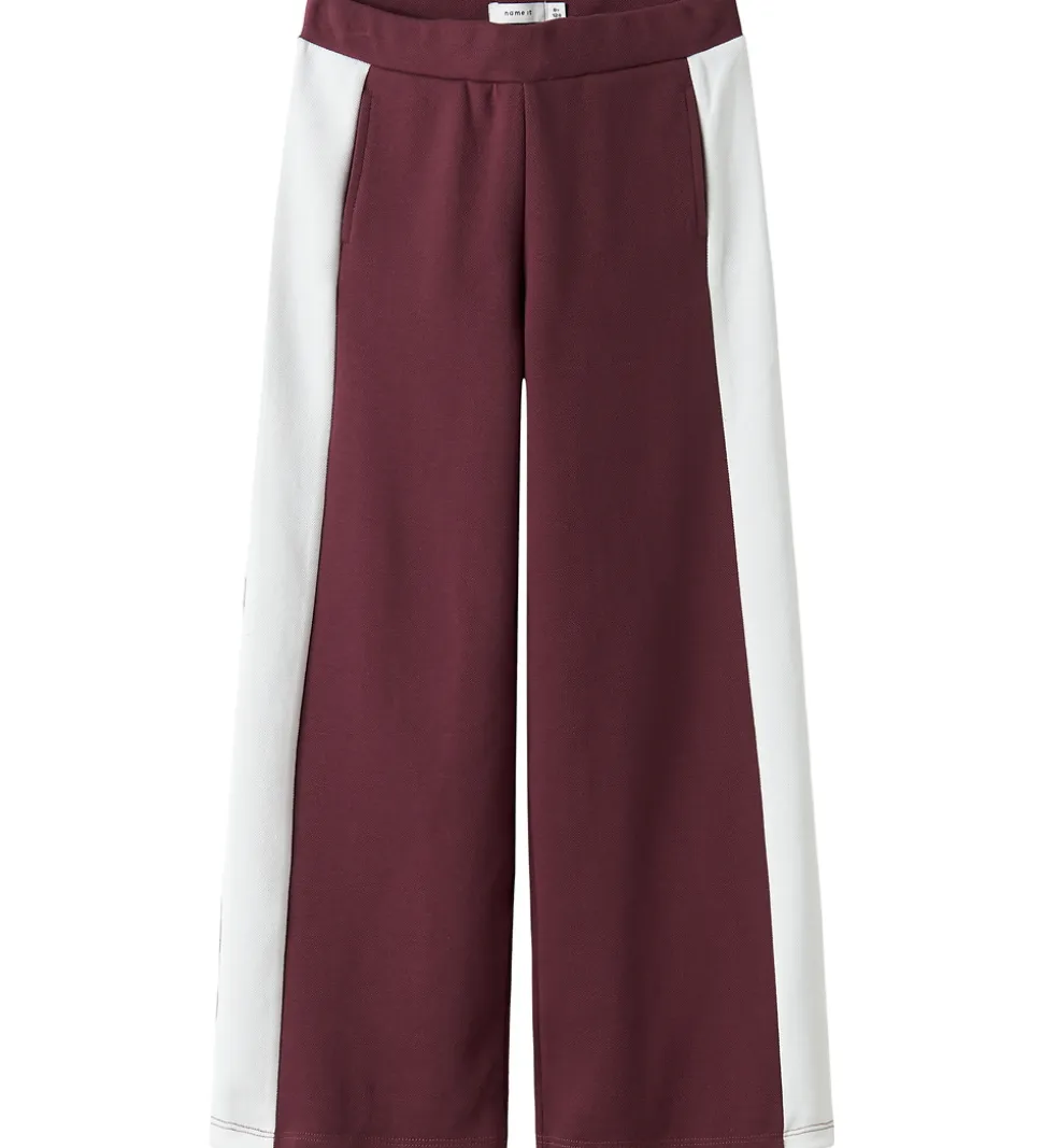 Moderne bukser fra Name It i bordeauxrød piqué med hvide konstraststriber langs siderne. Name It bukserne har en afslappet pasform med brede ben. De har en god elastik i taljen, som kan justeres med knapper indvendigt. Øverst er der en lomme i hver side.