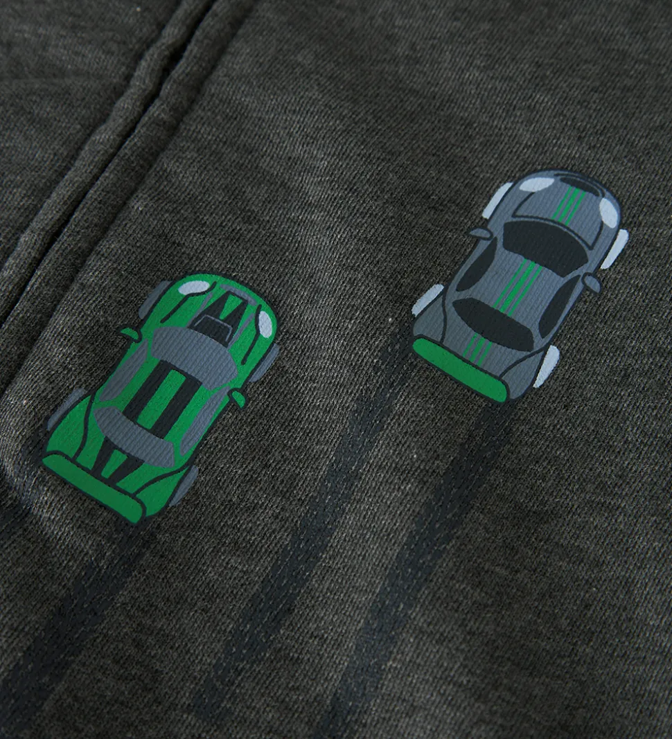 Smart Name It cardigan i meleret mørkegrå med print af racerbiler i forskellige farver på fronten. Name It cardiganen har en blød hætte og lange ærmer. Den lukkes fortil med en gennemgående lynlås. Indvendigt er der blødt, børstet bomuld.