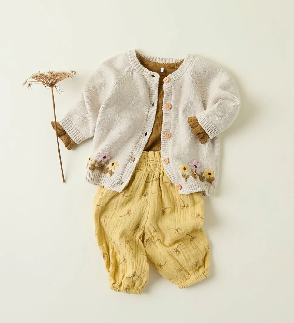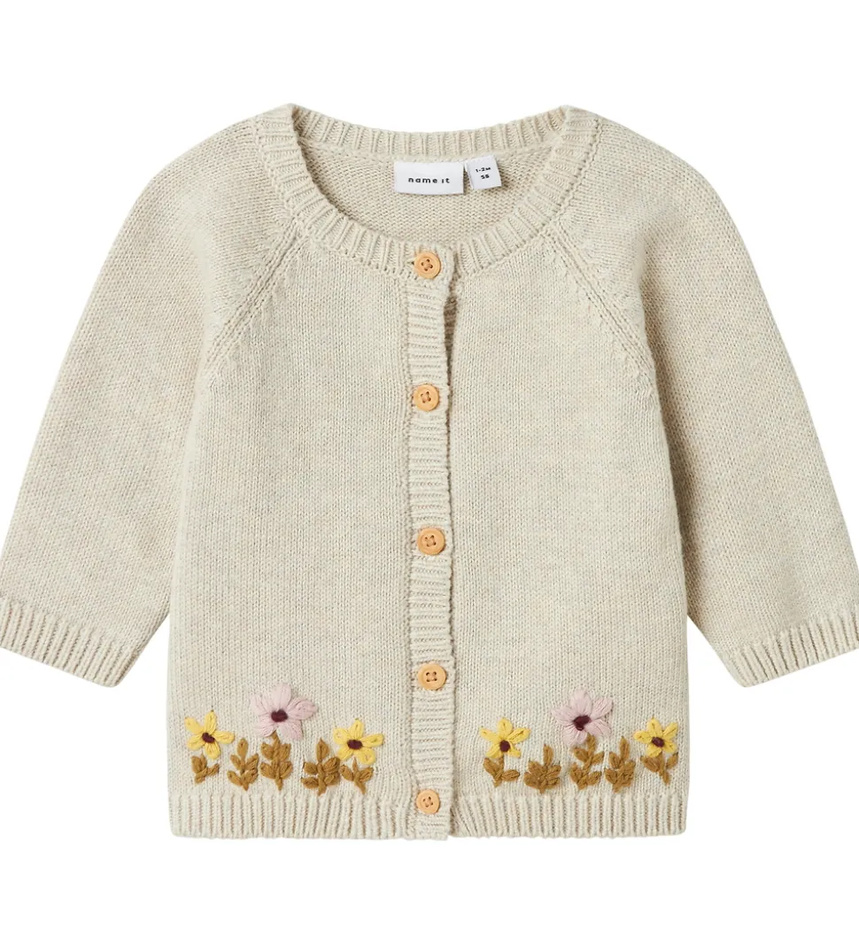 Charmerende Name It cardigan i en lys beige strik. Cardiganen er udsmykket med delikate blomsterbroderier i bunden, hvilket tilføjer en fin detalje.