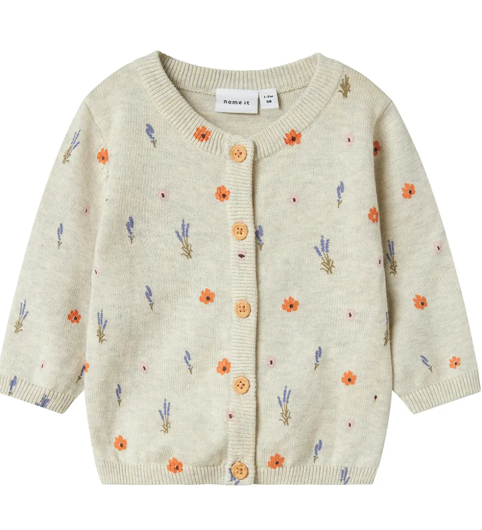 Fin Name It cardigan i beige strik med print af fine blomster i orange, rosa, blå og grønne nuancer. Cardiganen har en klassisk rund halsudskæring og lukkes med lyse knapper foran. Name It cardiganen har lange ærmer og ribkanter ved alle åbninger.