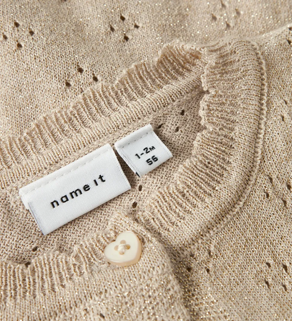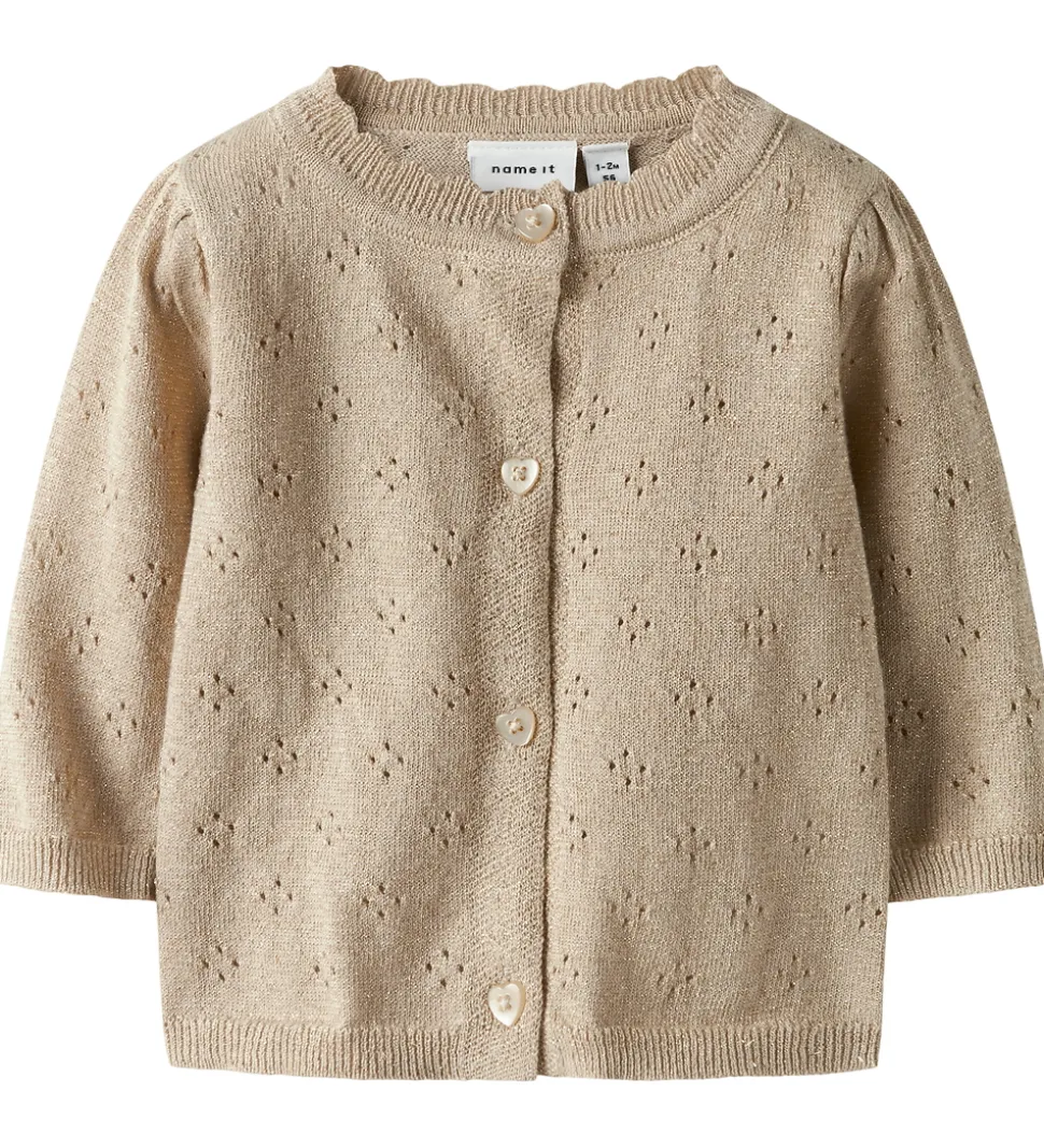 Elegant Name It cardigan i beige med guld glimmer. Cardiganen har strikket struktur med fint hulmønster. Den har en rund halsudskæring med en bølget kant og lange ærmer med puf ved skuldrene. Cardiganen har en gennemgående knaplukning fortil med hjerteformede knapper.