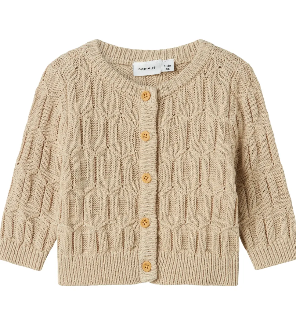 Flot Name It cardigan i en lys, beige nuance der har et smukt, strikket mønster med geometriske strukturer. Cardiganen fra Name It er forsynet med en praktisk knaplukning foran med træknapper.