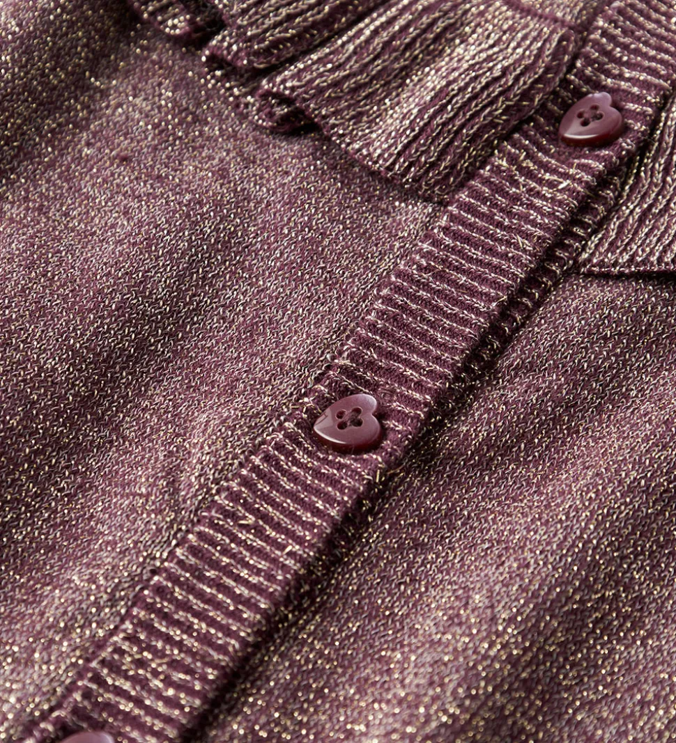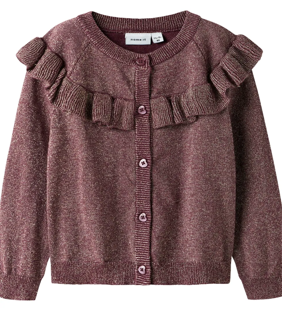 Flot Name It cardigan i mørkerød og guld med strikket struktur. Cardiganen har fine detaljer med flæser over brystet og en rund halsudskæring. Den har en gennemgående knaplukning foran og lange ærmer.