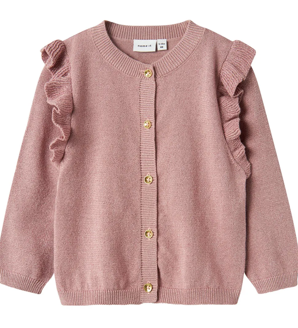 Lækker Name It cardigan i gammelrosa strik, med en flot glimmereffekt.