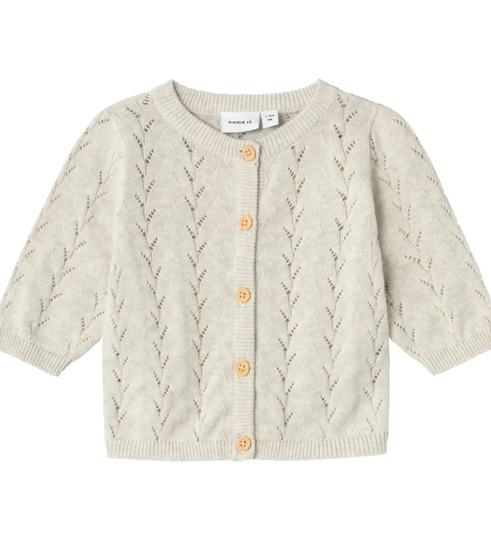 Lækker Name It cardigan i meleret beige strik, med et flot hulmønster.