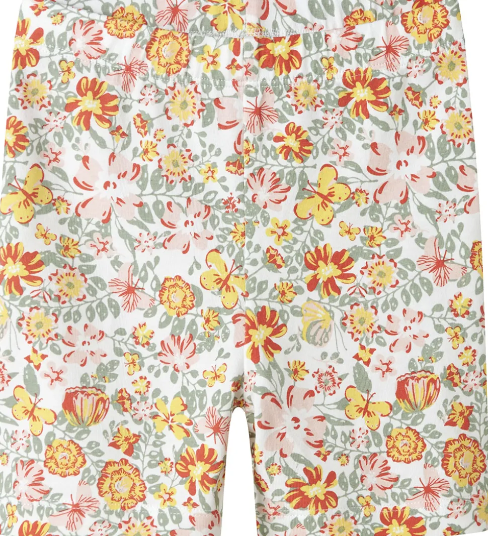 Farverige Name It cykelshorts med et livligt blomster- og sommerfugleprint i røde, gule og grønne nuancer mod en støvet hvid baggrund. Shortsene har en elastisk talje, der sikrer en god pasform.