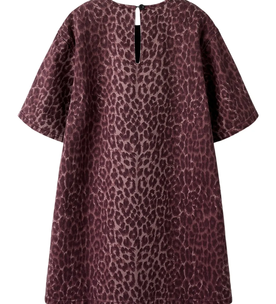 Sej Name It kjole med leopardprint i lilla nuancer. Kjolen er lavet af denim med en rund halsudskæring med knap i nakken og korte ærmer. Den er designet med klassisk A-snit.