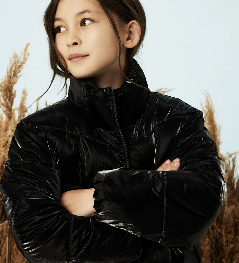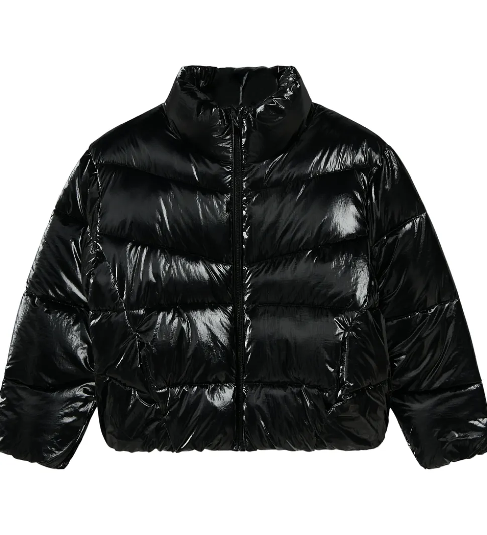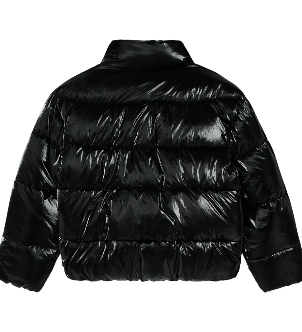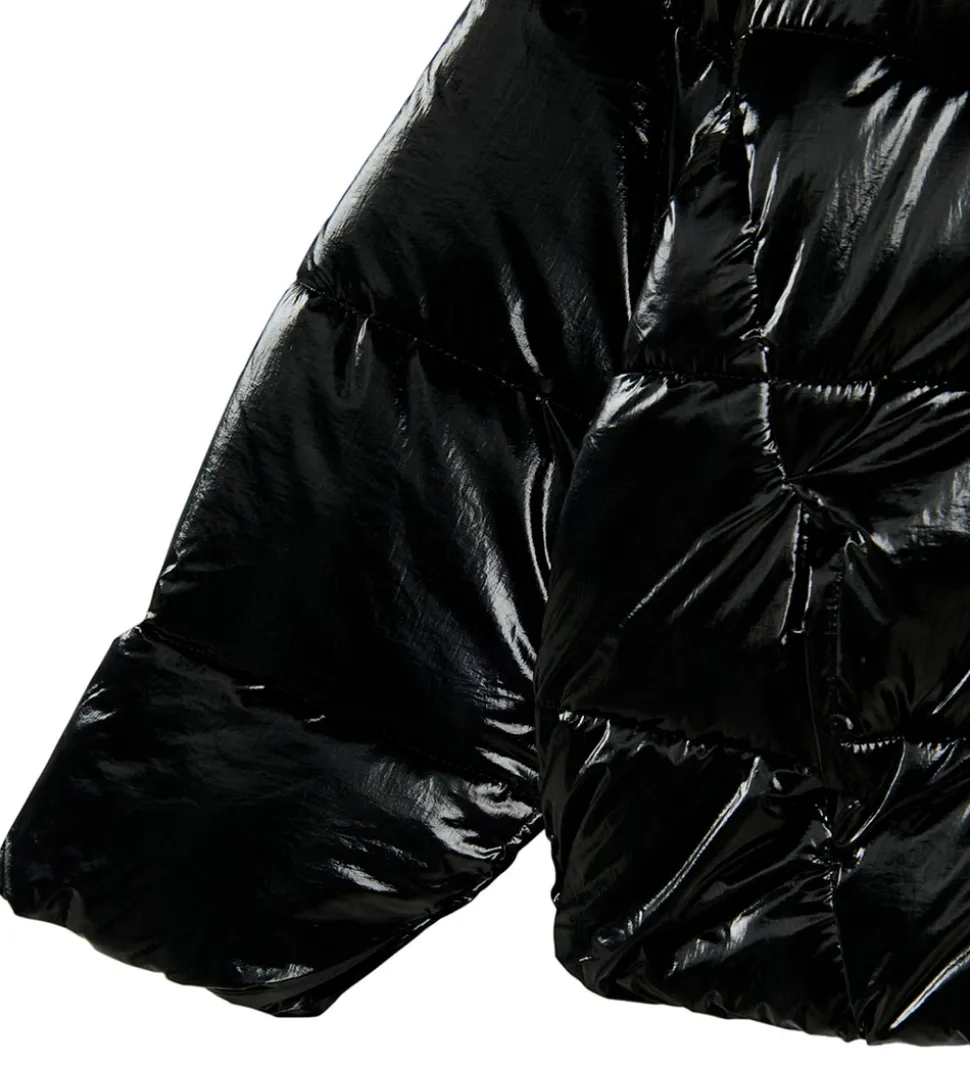 Stilfuld Name It dynejakke i skinnende sort, der giver et moderne og elegant udtryk. Dynejakken har brede vandrette syninger, der skaber en fyldig og blød struktur.