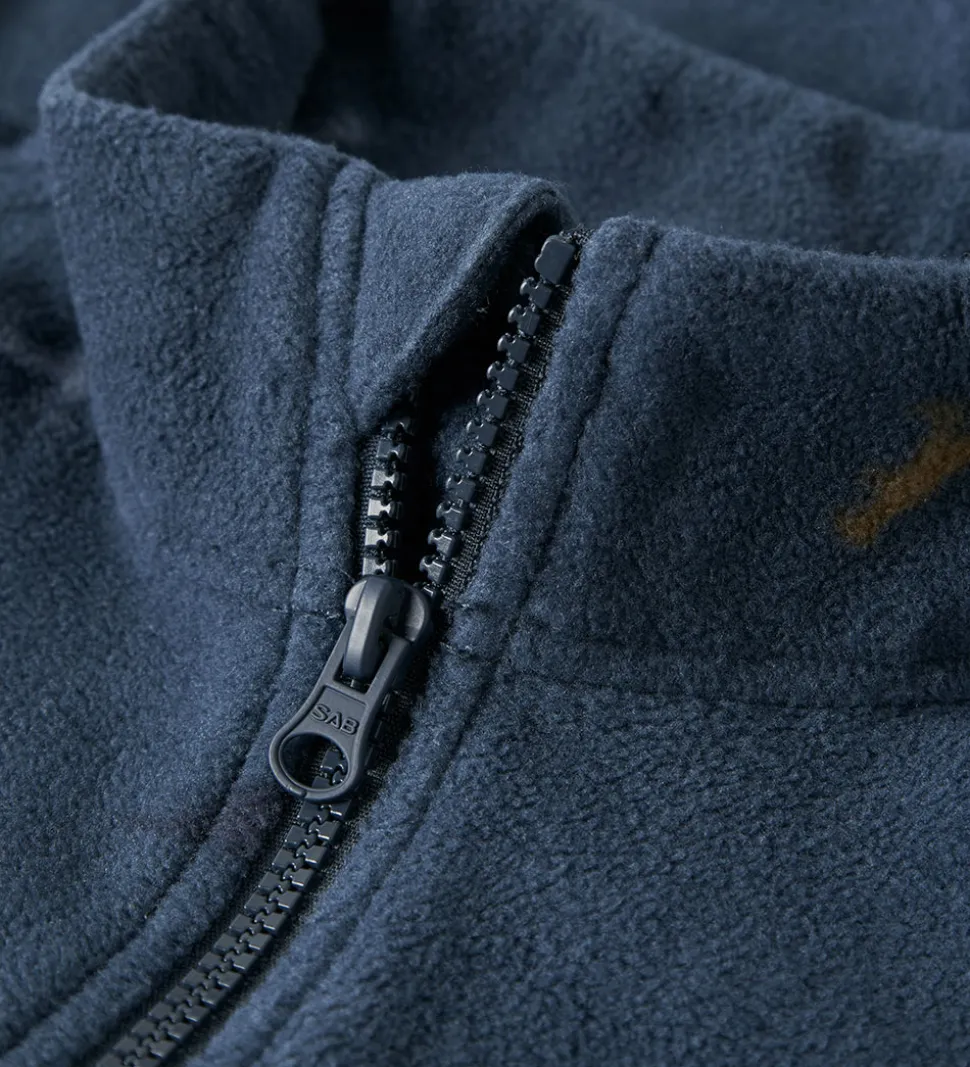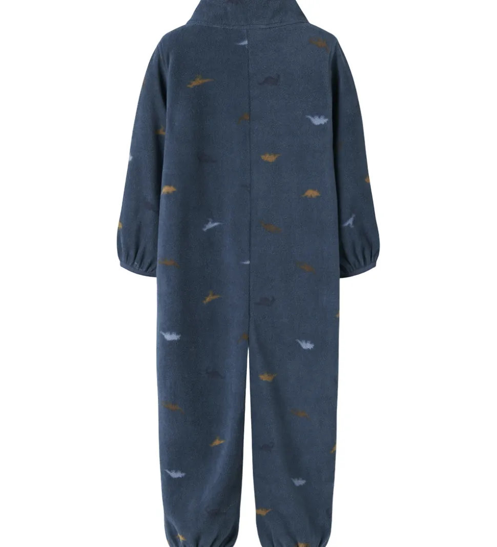 Bhagelig Name It fleecedragt i en flot mørkeblå farve med et diskret mønster af små dinoer i forskellige nuancer.