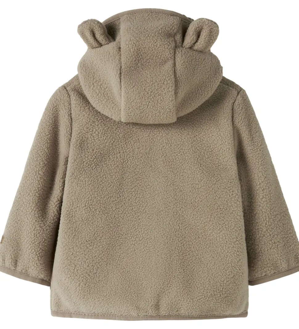 Name It fleecejakken er designet med en hætte, der har små søde ører, og har lange ærmer. Fleecejakken åbnes foran med en lynlås, der har en praktisk hagebeskytter foroven.