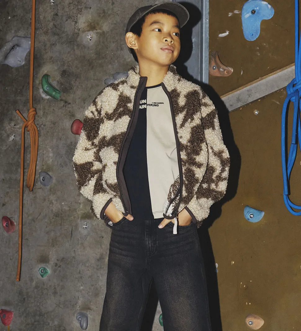 Moderne Name It fleecejakke med et smukt mønster i brune og beige nuancer. Fleecejakken er lavet af blødt teddyfleece, der giver et varmt og behageligt udtryk.