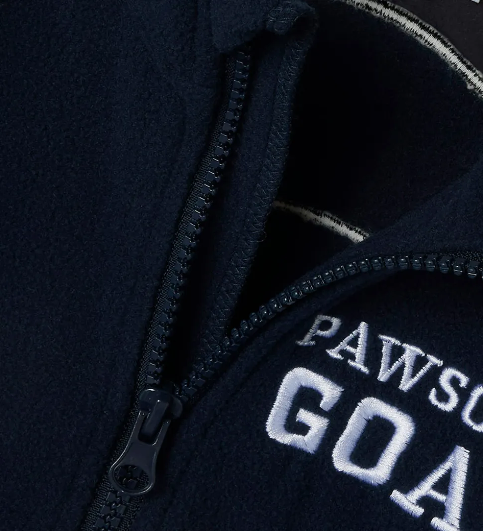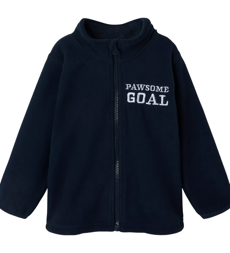 Stilren Name It fleecejakke i dyb marineblå med teksten “Pawsome Goal” broderet i hvid på brystet.