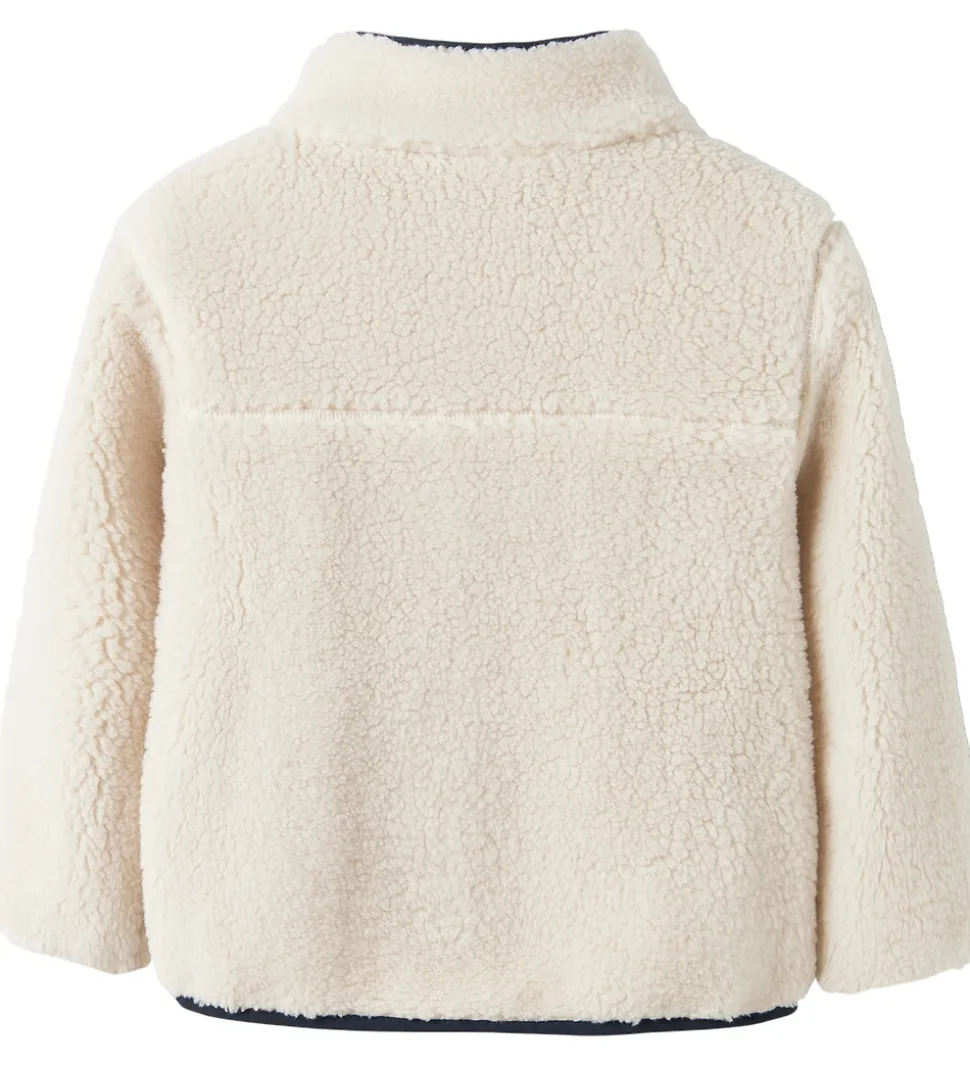 Charmerende Name It fleecejakke i en blød cremefarve med kontrastdetaljer i mørkeblå. Fleecejakken har en høj hals og lange ærmer. Fronten har en gennemgående lynlås, der giver nem adgang. Name It fleecejakken er udstyret med en lille praktisk brystlomme og to frontlommer, der tilføjer funktionalitet og stil.