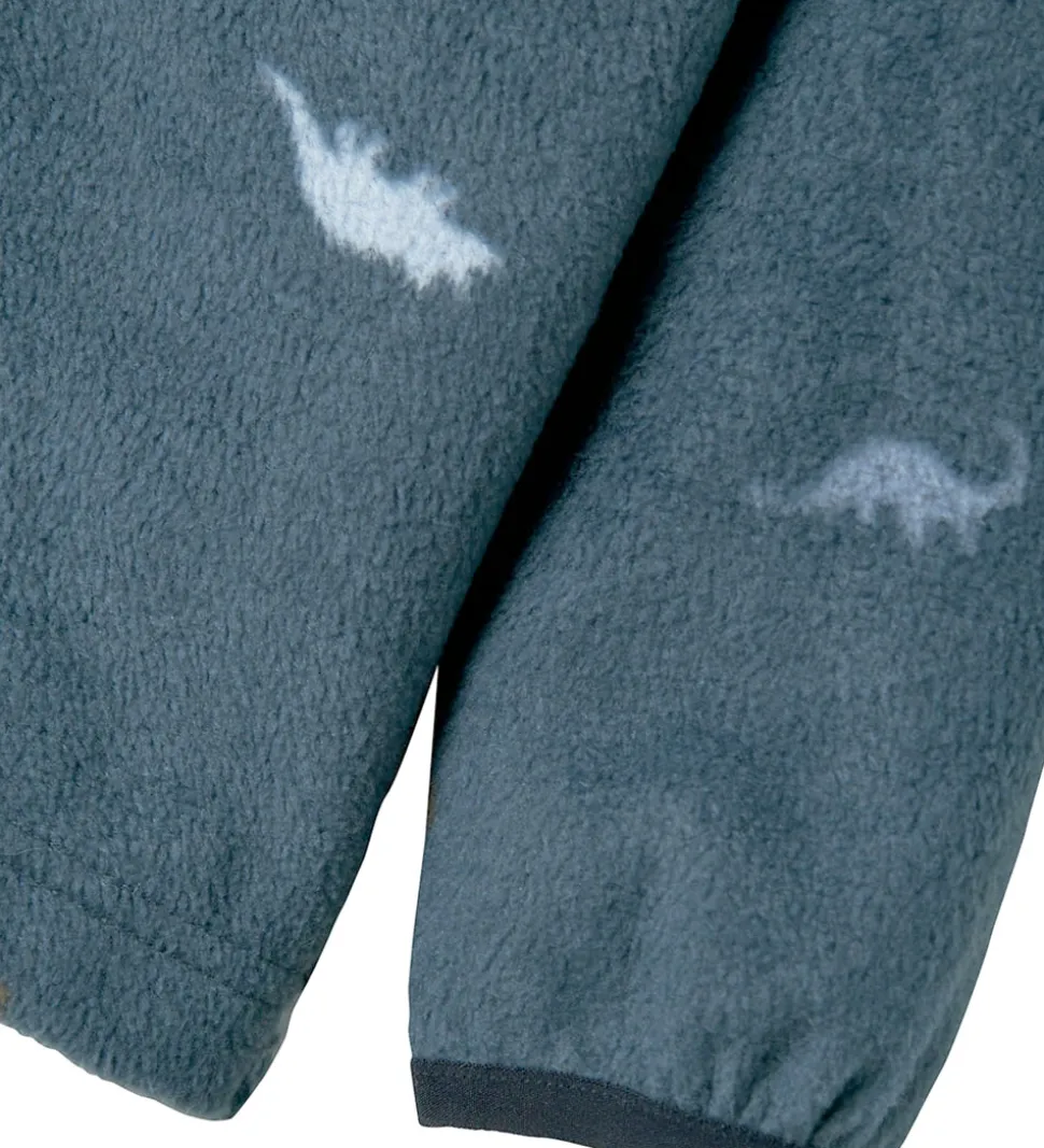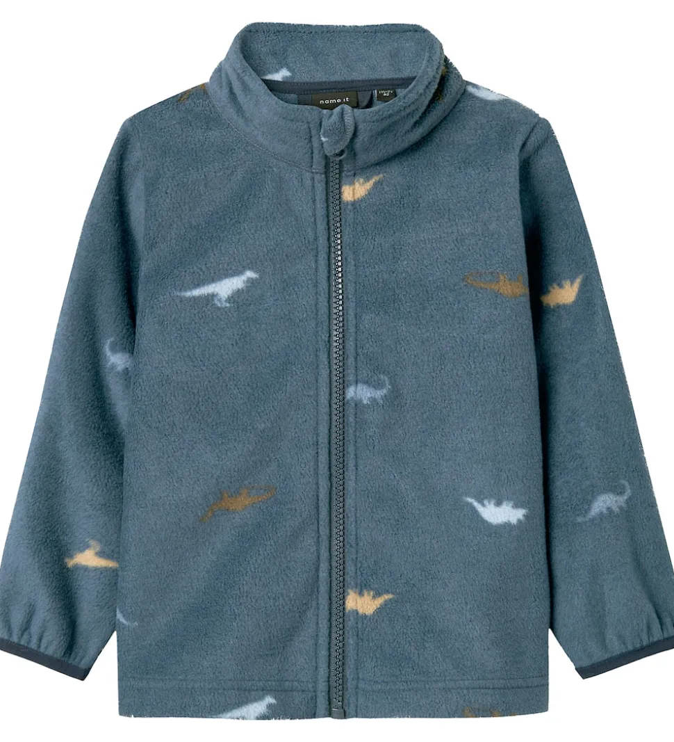 Behagelig Name It fleecejakke i en afdæmpet blå farve med et mønster af små dinosaurer i hvide, grå og brune nuancer.