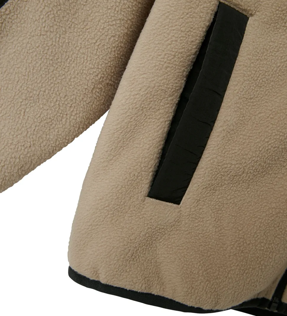 Lækker Name It fleecejakken i beige, fint fleece og med sorte, glatvævede detaljer.