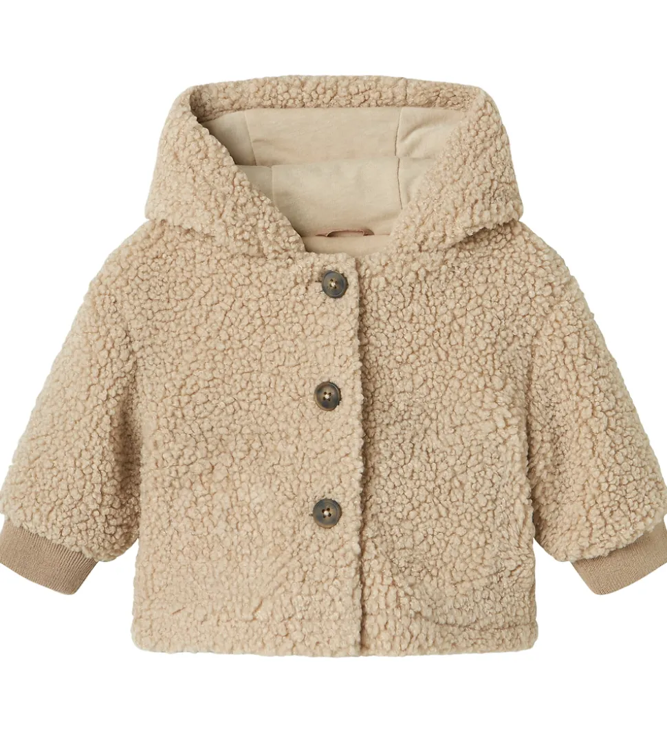 Behagelig Name It fleecejakke i en varm, lys beige nuance med en blød teddyfleecestruktur. Fleecejakken har en enkel knaplukning foran med tre mørke knapper, der giver et klassisk udtryk. Den har lange ærmer med ribkanter, der sikrer en god pasform. Hætten er foret og tilføjer ekstra varme til fleecejakken. Produktet har en praktisk lomme foran på venstre side.