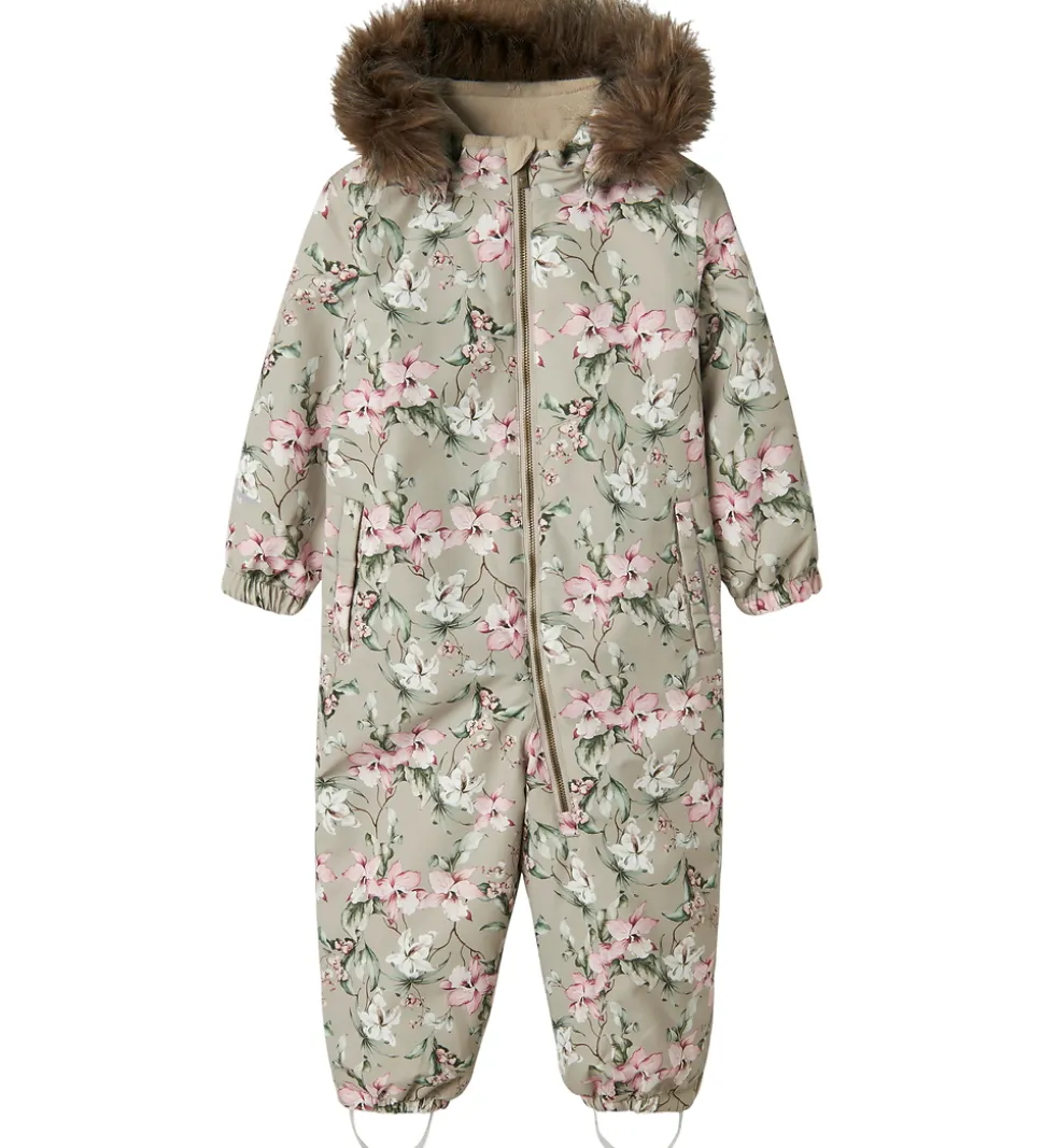 Skøn Name It flyverdragt i lysegrøn med et alloverprint af blomster i rosa, hvide og grønne nuancer. Flyverdragten har praktiske refleksdetaljer.