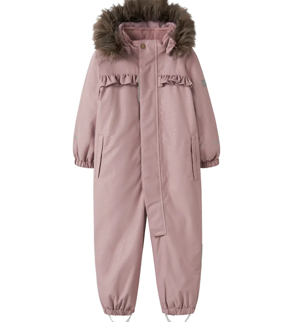 Name It flyverdragten har en aftagelig hætte, som sidder fast med skjulte trykknapper, og den har en flot kant af imiteret pels, som sidder fast med trykknapper. Hættens ansigsåbning har også en indvendig elastikkant af fleece. Ærmerne og benene har elastikkanter, og der er aftagelige, justerbare gummistropper til at sætte under støvlerne. Benåbningerne kan løsnes lidt ved hjælp af velcro og en trykknap.