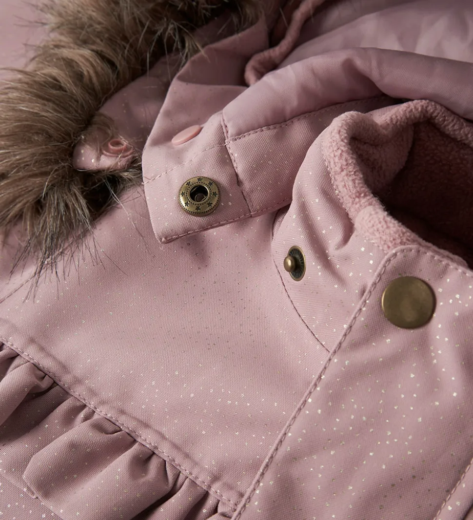 Dejlig Name It flyverdragt i støvet rosa med guldprikker over det hele. På tværs af brystet er der en sød flæsekant.