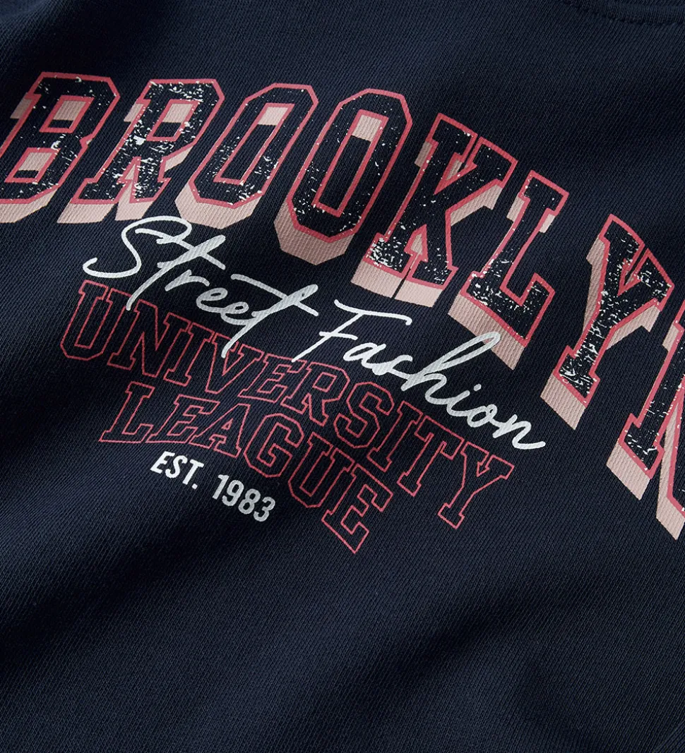 Stilfuld Name It hættetrøje i en dyb navy med et iøjnefaldende print med teksten “Brooklyn Street Fashion University League” i kontrasterende nuancer af hvid og rosa.