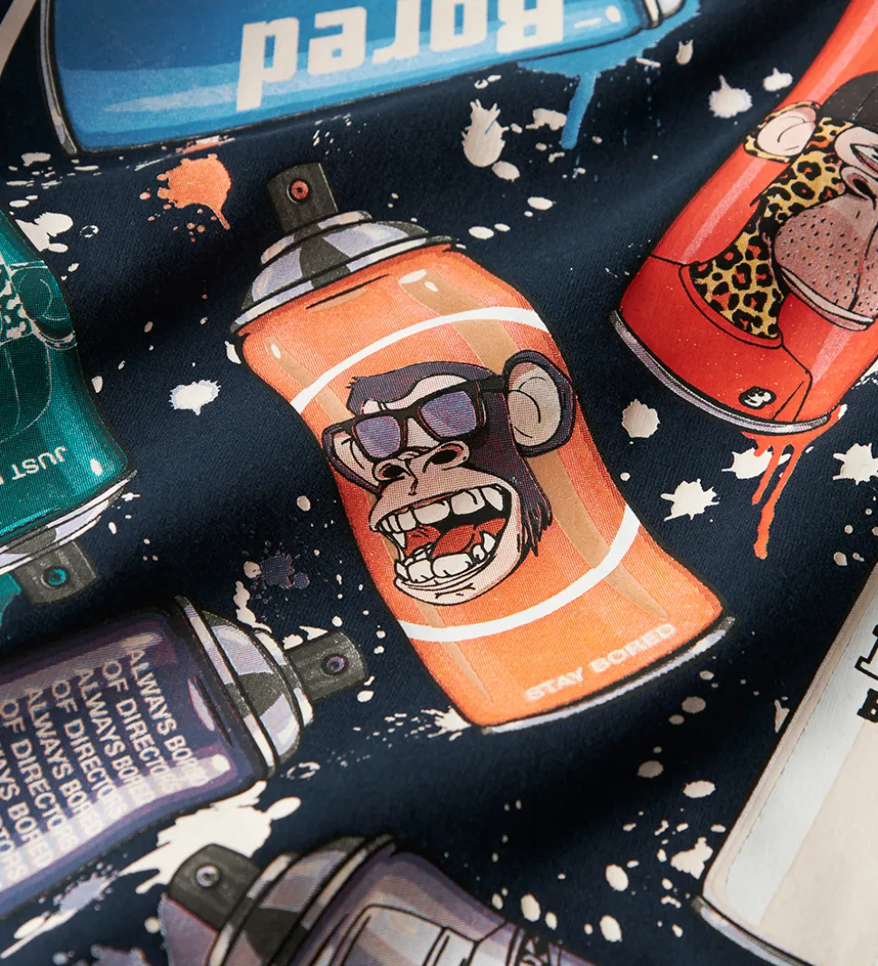 Trendy Name It hættetrøje i en dyb navyblå farve med et iøjnefaldende print på fronten med teksten “Just Stay Bored” i hvide og røde nuancer. På ryggen er der et stort print af farverige spraydåser. Hættetrøjen har en blød hætte og lange ærmer med ribkanter i ærme- og taljeåbning. Indvendigt er der blødt, børstet bomuld