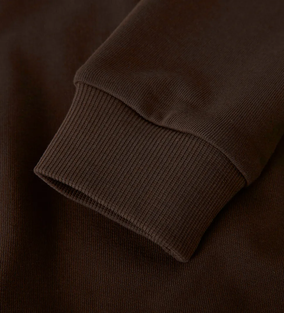 Stilren Name It hættetrøje i en dyb, mørkebrun farve. Hættetrøjen har en klassisk hætte og ribkanter ved ærmerne og nederst, som giver et afslappet look. En funktionel tilføjelse til garderoben.