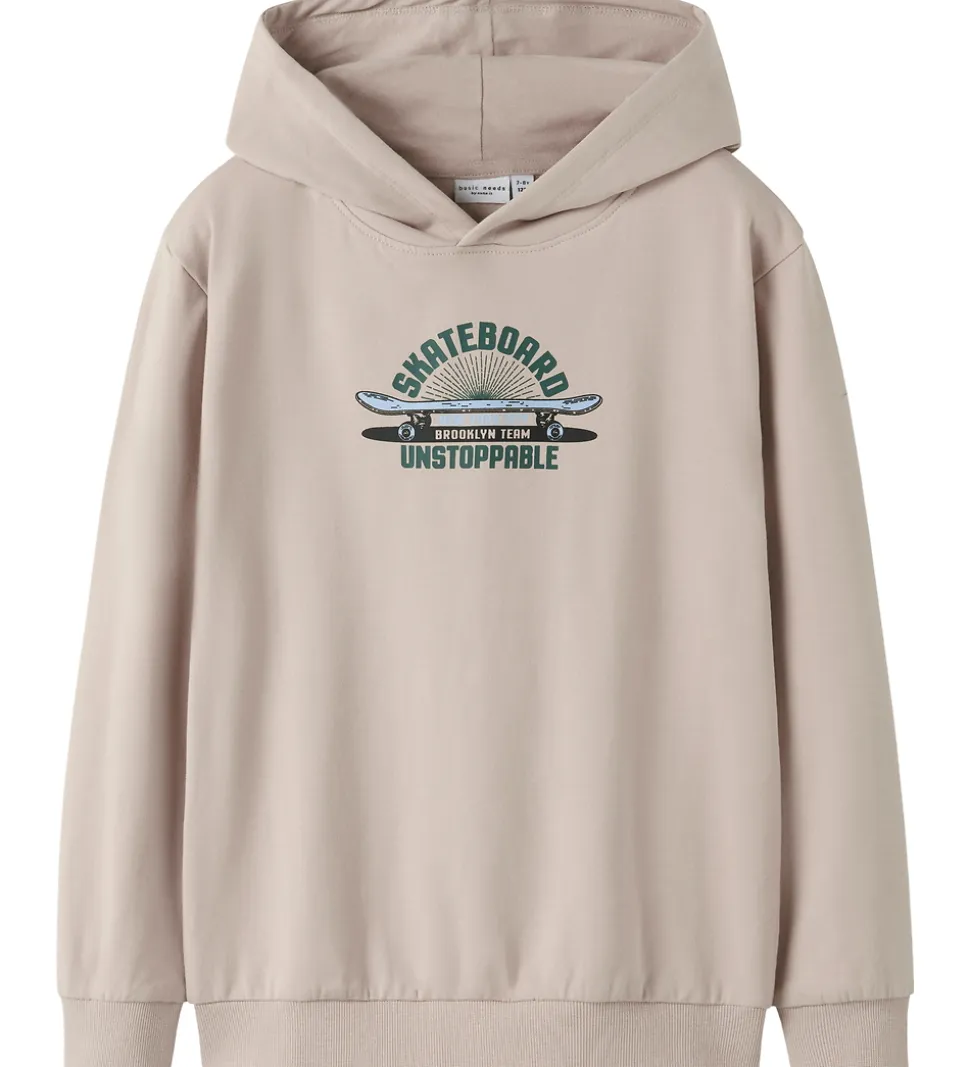 Skøn Name It hættetrøje i beige med et skateboard-print på fronten i grøn, sort og blå. Hættetrøjen fra Name It er designet med en rummelig hætte og har brede ribkanter ved ærmerne og i livet, der sikrer en god pasform. Indvendigt er der blødt, børstet bomuld.