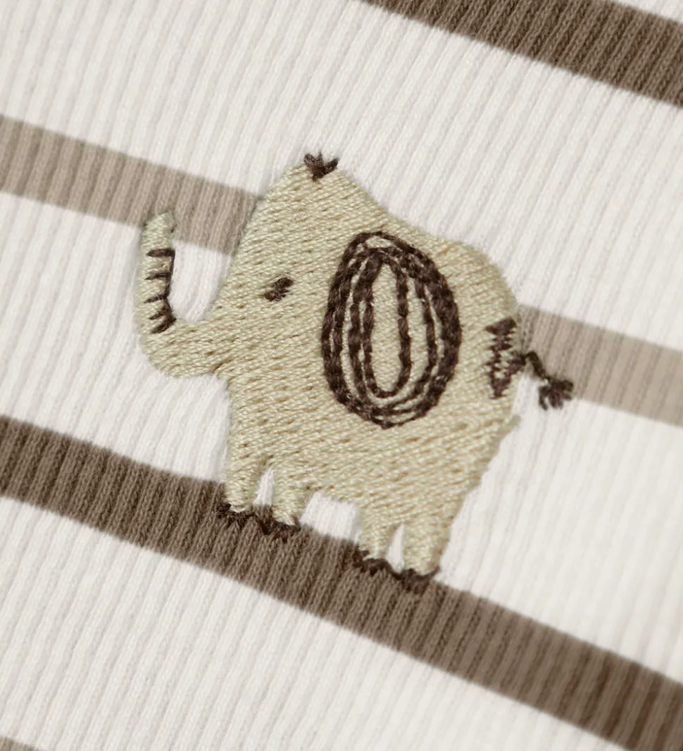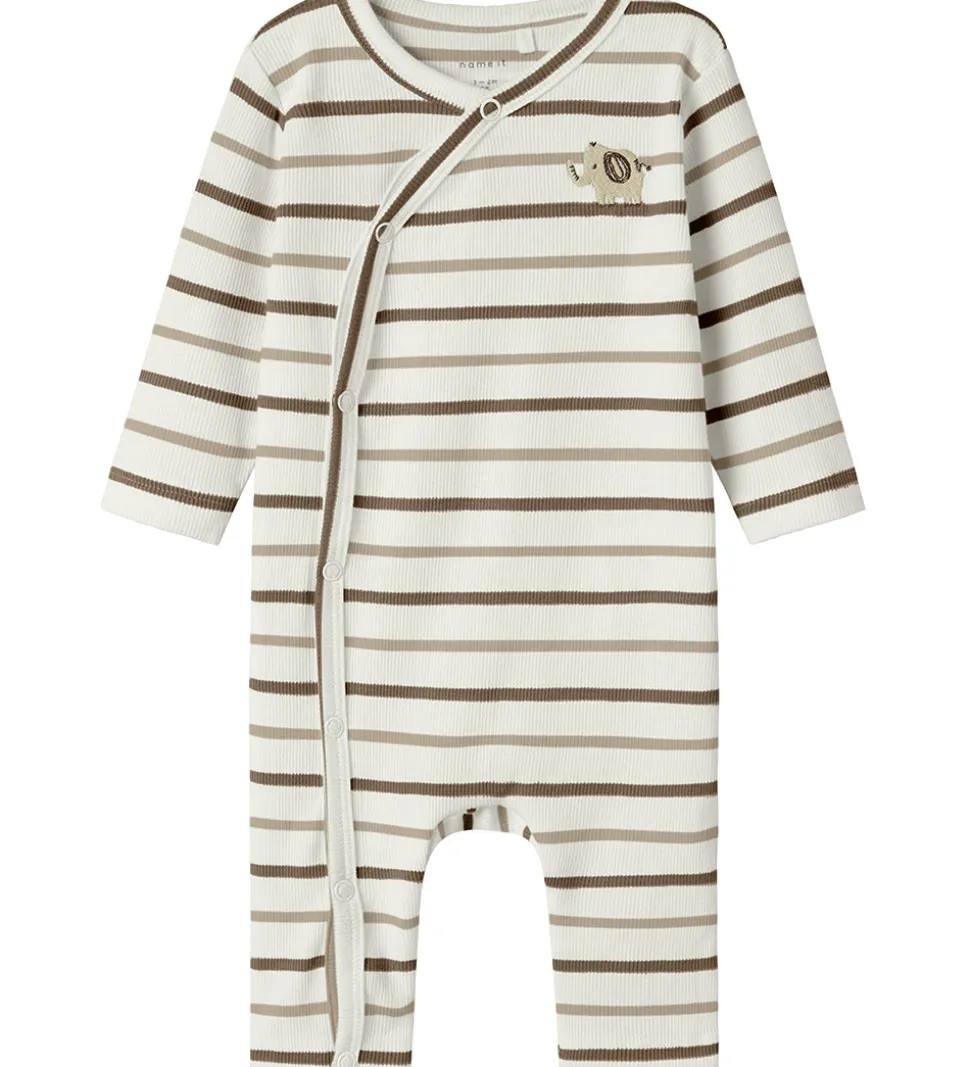 Charmerende Name It heldragt i hvid med striber i brun og beige og en lille broderet elefant på venstre bryst. Heldragten har ribstruktur og lange ærmer og ben. Den lukkes med gennemgående trykknapper langs højre side.