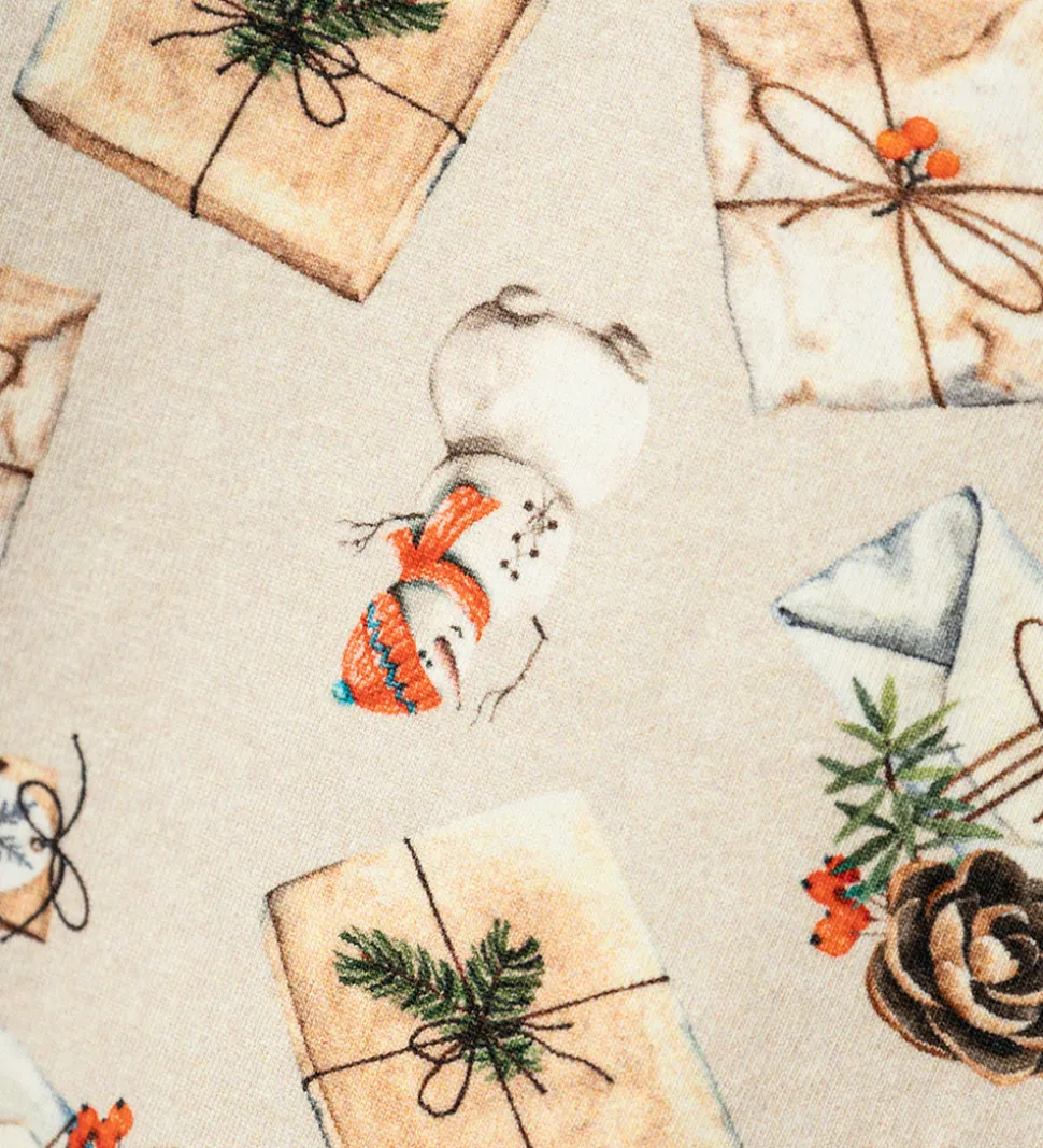 Lækker Name It heldragt med lange ærmer i en lys beige nuance, prydet med et fint print af gaver, grantræer og julemotiver.