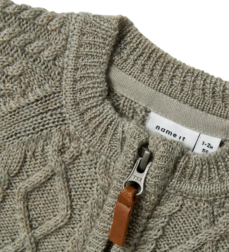 Elegant Name It heldragt i en støvet, grøn nuance med et klassisk, flettet strikmønster. Heldragten har en blød struktur og er designet med lange ærmer og ben.