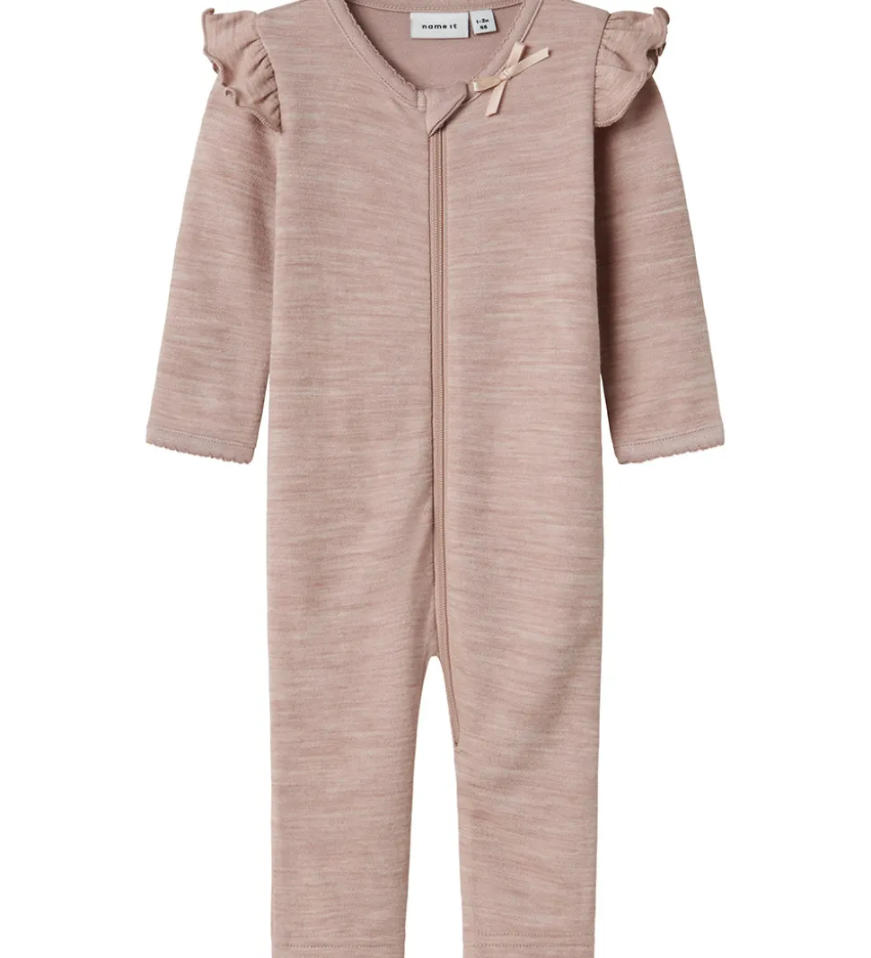 Flot Name It heldragt i meleret rosa med en sløjfedetalje foran. Heldragten har en rund halsudskæring med en fin blondekant, og lukkes foran med en lynlås med hagebeskytter. Den har lange ærmer med flæsedetaljer ved skuldrene og blondekanter i ærmeåbningerne. Heldragten har lange ben med mulighed for ombuk til lukkede fødder.