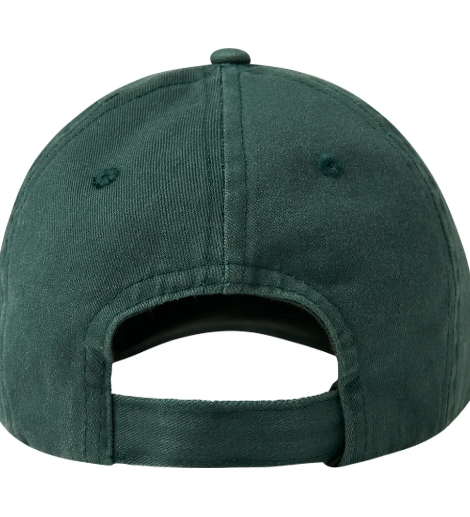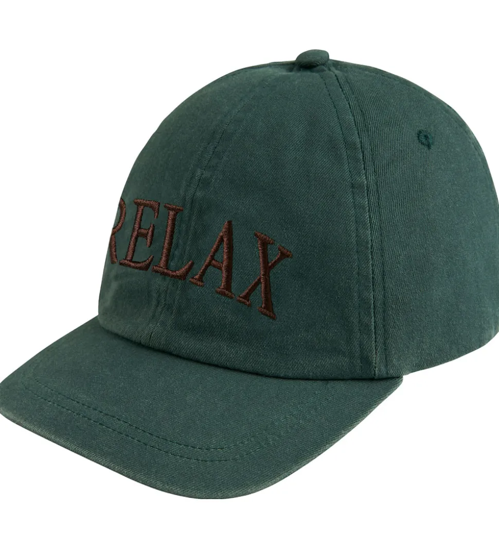 Elegant Name It kasket i en dyb, grøn nuance med teksten “RELAX” broderet i brun. Kasketten har en klassisk, buet skygge, der giver skygge fra solen.