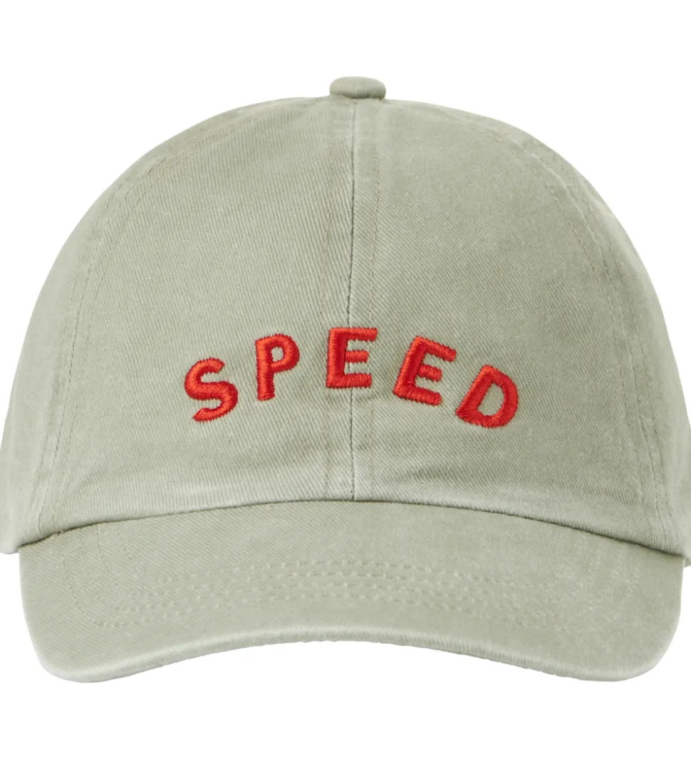 Flot Name It kasket i en grøngrå nuance med “SPEED” broderet i rød skrift. Name It kasketten har en buet, fast skygge fortil. Den kan justeres i nakken med et praktisk velcrobånd, som ligger skjult under det indvendige svedbånd.