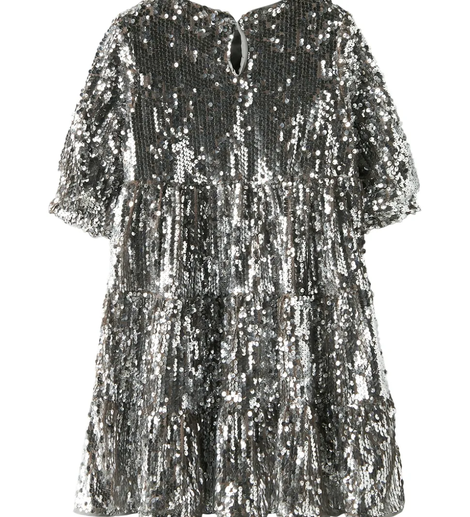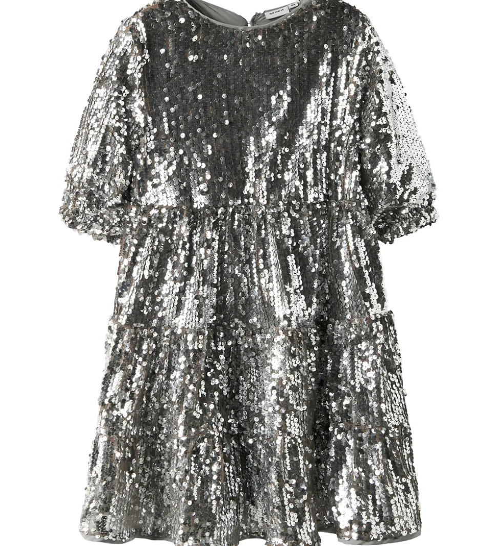 Festlig Name It kjole med sølv palietter. Kjolen har en rund halsudskæring og en knap i nakken. Den har korte ærmer med elastik i ærmeåbningerne. Kjolen er skåret tre steder i skørtet, hvor der er rynker, som giver ekstra vidde. Inderst er der et lag genanvendt polyester.