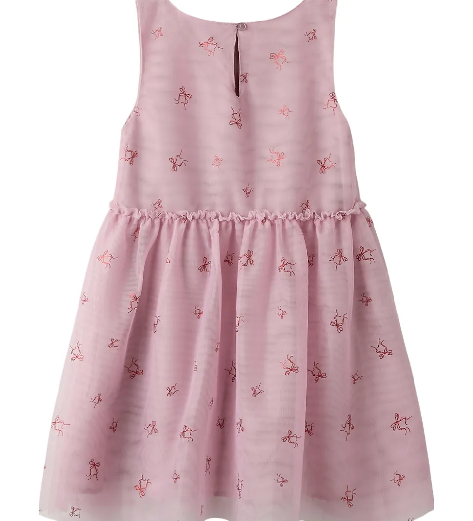 Elegant Name It kjole i rosa med et smukt mønster af små sløjfer i rød glimmer. Name It kjolen er ærmeløs og har en rund halsudskæring med en knap i nakken. Kjolen består af et lag polyester inderst og flere lag tyl yderst.