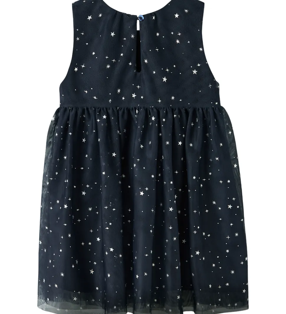 Elegant Name It kjole i navyblå med stjerner i sølv glimmer. Name It kjolen er ærmeløs, og har en rund halsudskæring med en knap i nakken. Kjolen består af et lag genanvendt polyester inderst og to lag tyl yderst.