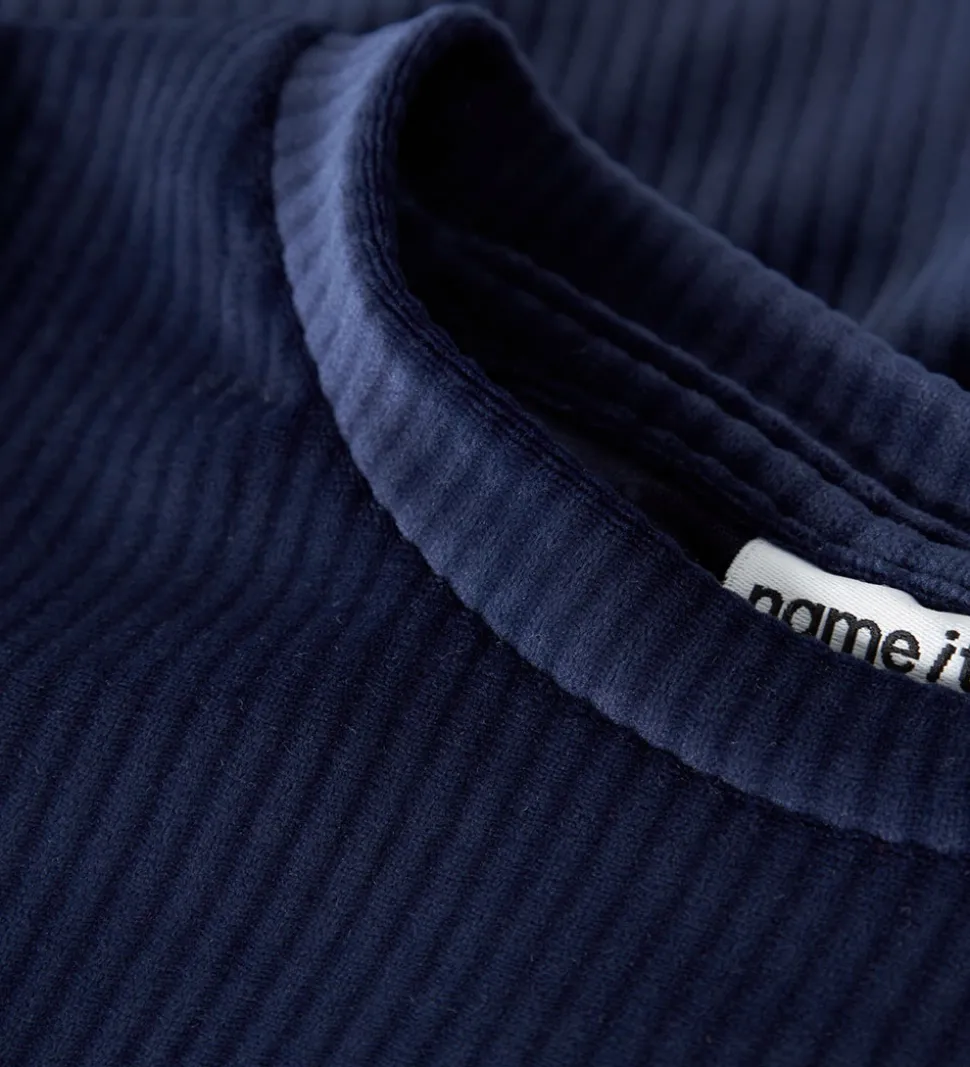 Elegant Name It kjole i en dyb, mørkeblå nuance. Kjolen har lange ærmer og en flot, velour-struktur. Name It kjolen er designet med et skørt, der giver den et klassisk look.
