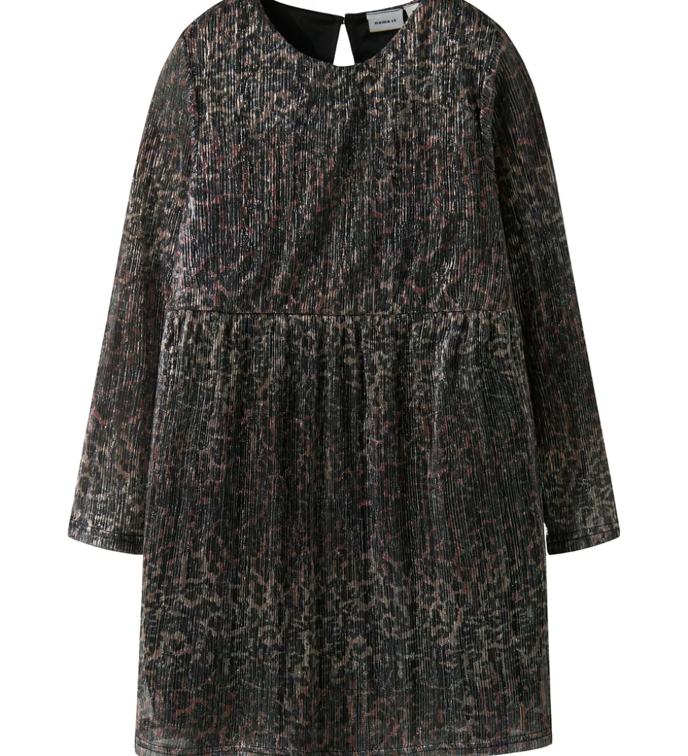 Smart kjole fra Name It med leopardmønster i sort og brune nuancer og glimmereffekt. Kjolen har plisseret struktur og rund halsudskæring med knaplukning i nakken. Den har semitranparente ærmer og har en syning ved taljen.